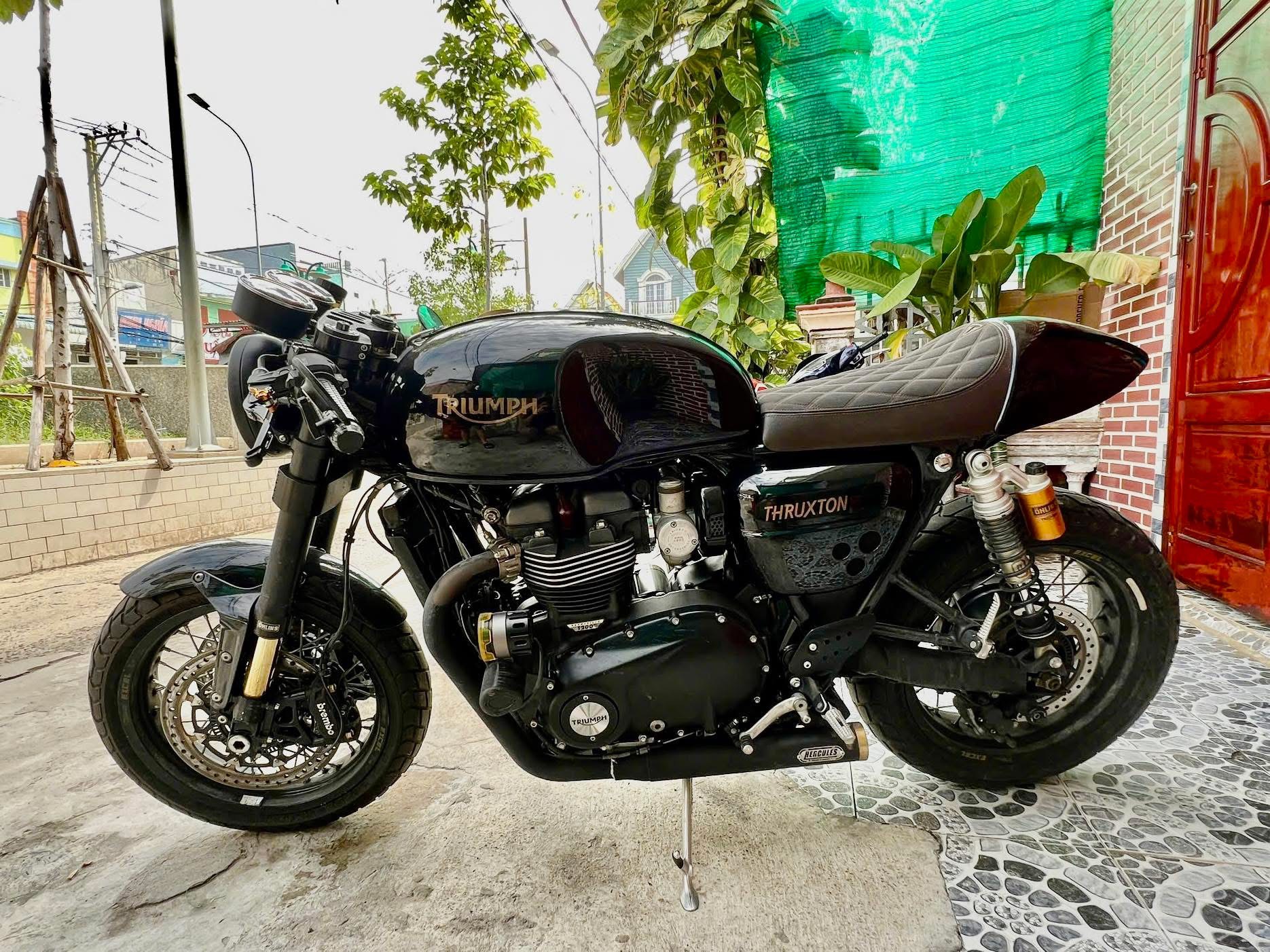 Triumph Thruxton 1200R vào dàn chân trước phuộc Ohlins, chảng ba-ghi đông IMA, pô Hercules.